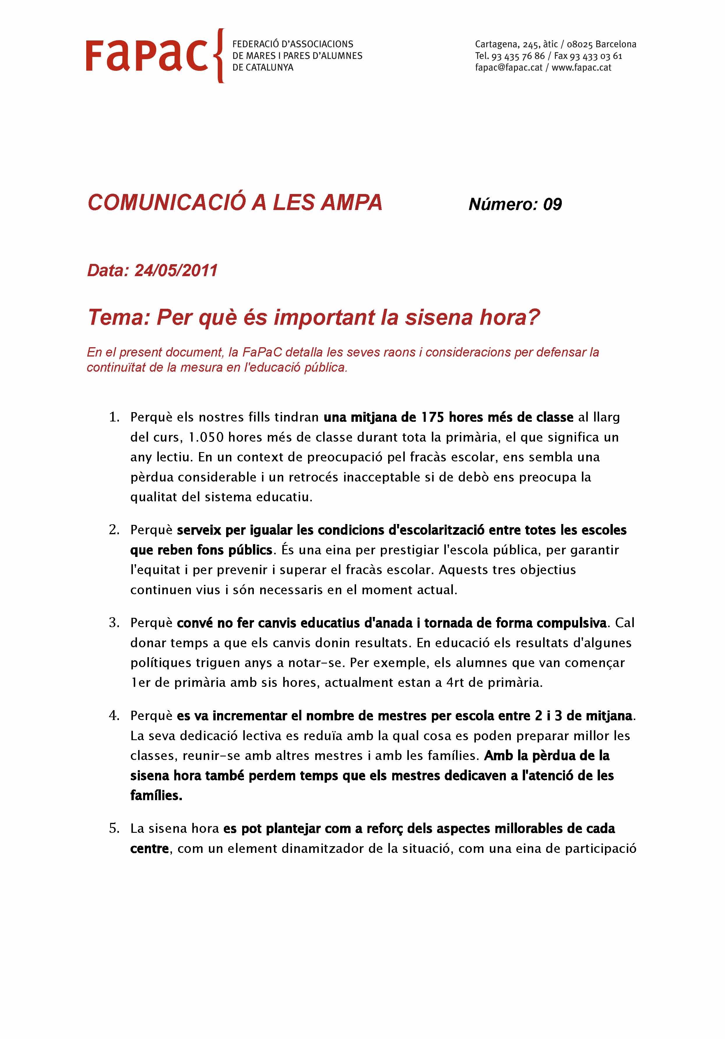Sense entrar en valoracions personals, publiquem un comunicat de la FaPaC a les AMPA on es detallen les seves raons i consideracions per defensar la continuïtat de la sisena hora.