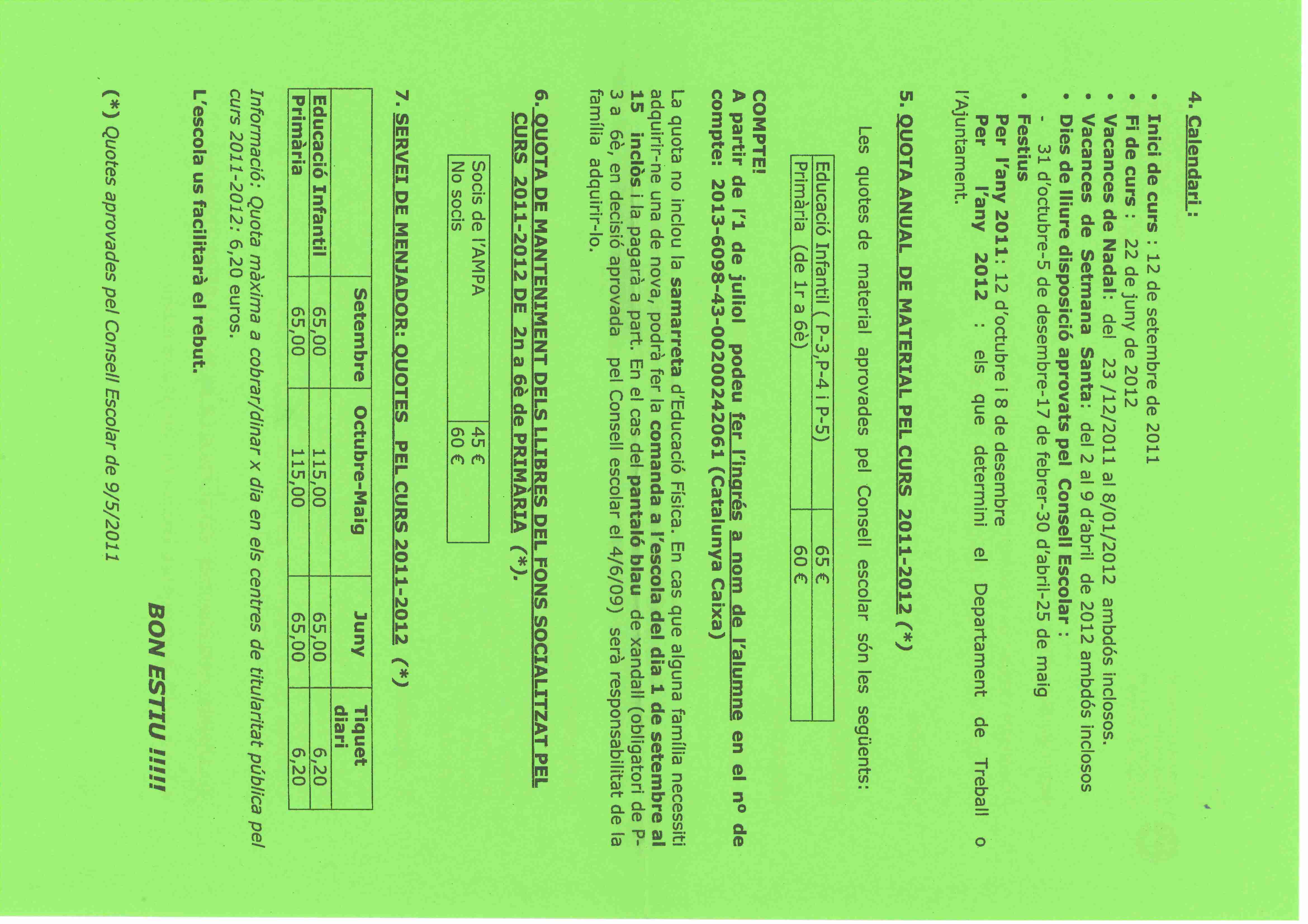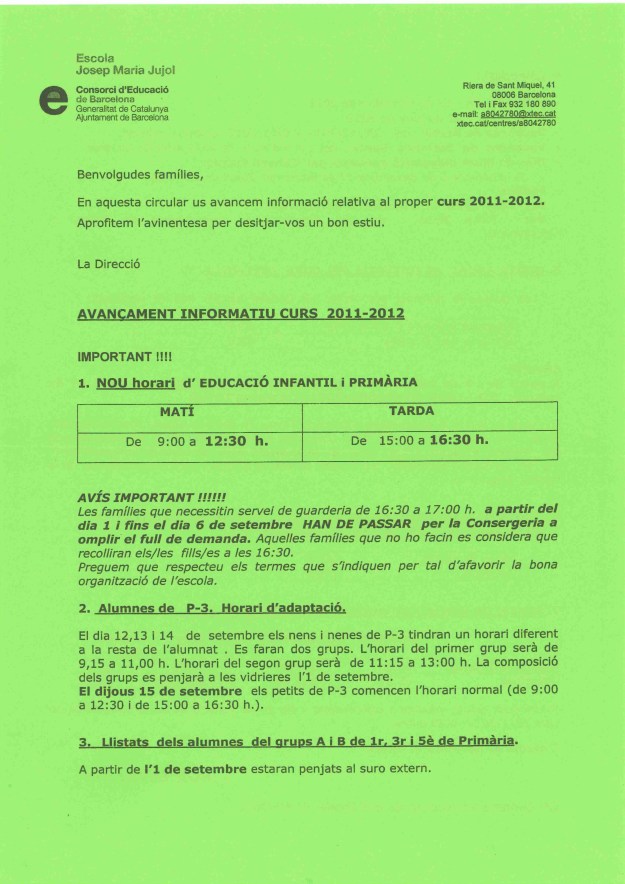 L’escola informarà a través del full informatiu que es reparteix cada any a través de les motxilles dels nens.