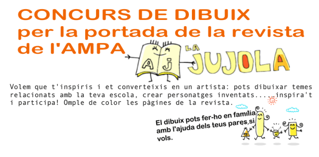 Torna la JUJOLA, la revista de l’AMPA de l’escola. Volem que sigui més interactiva que mai i volem aprofitar per celebrar els 25 anys de l’escola amb tots els alumnes. Per això volem que tots els alumnes participin en un concurs de dibuix per triar la portada de la propera revista.