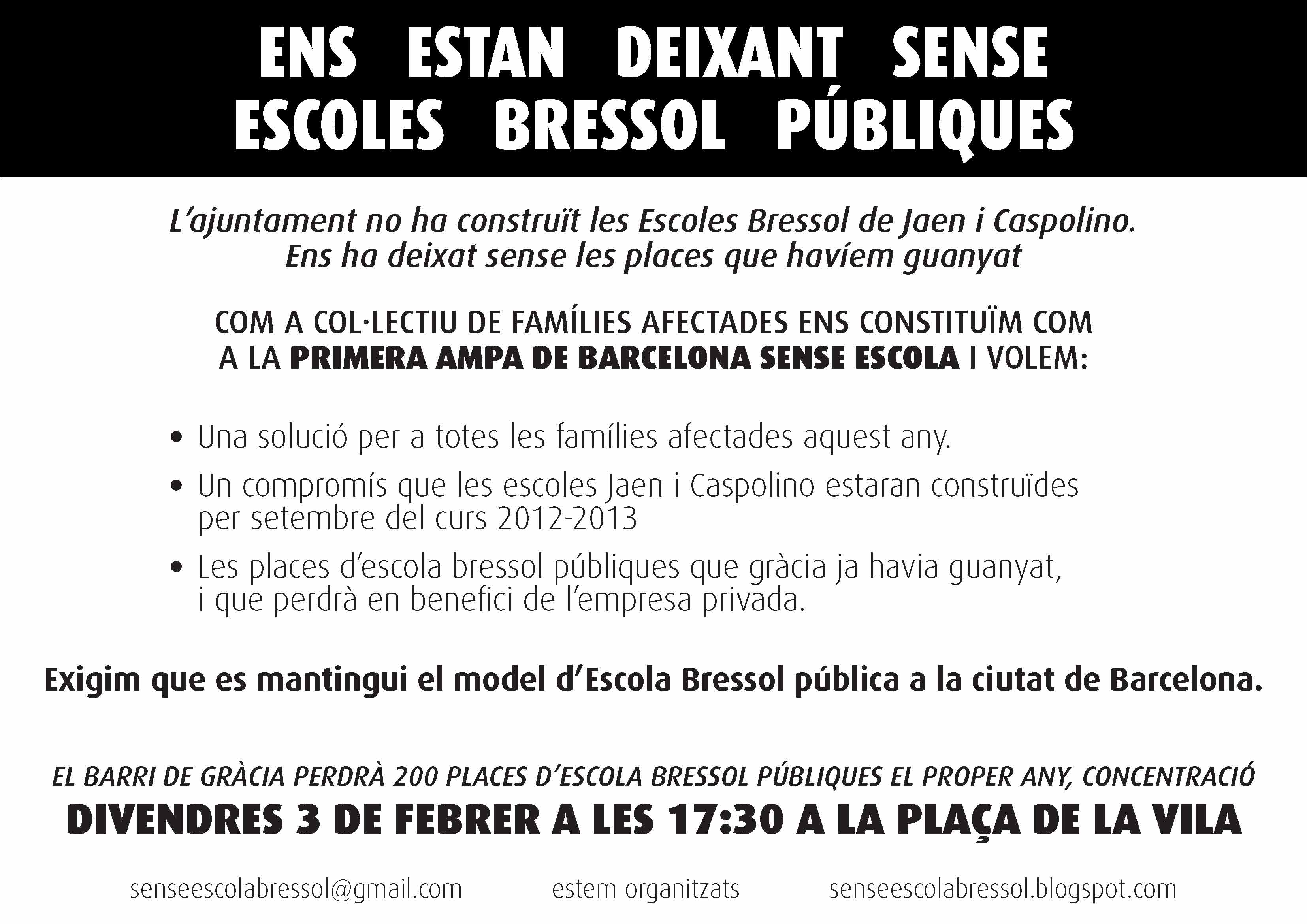 Aquestes famílies, davant la possibilitat que l’any vinent no s’acabin a temps les obres de les escoles o que el curs vinent passin a ser de gestió privada, fan una crida a les famílies i entitats del barri a lluitar en defensa de la construcció de les escoles i el manteniment de l’escola pública i convoquen tothom qui vulgui sumar-s’hi a una concentració el dia 3 de febrer a la Pl. de la Vila de Gràcia.