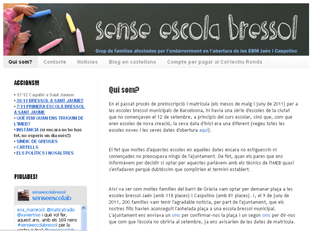 Les famílies afectades per l’endarreriment en l’obertura de les EBM Jaén i Caspolino (la del carrer Neptú!) s’estan movent per trobar una solució. Els nens que van aconseguir plaça, finalment no tenen ni plaça ni escola. Al bloc http://senseescolabressol.blogspot.com/ podeu trobar-hi la informació més actualizada.