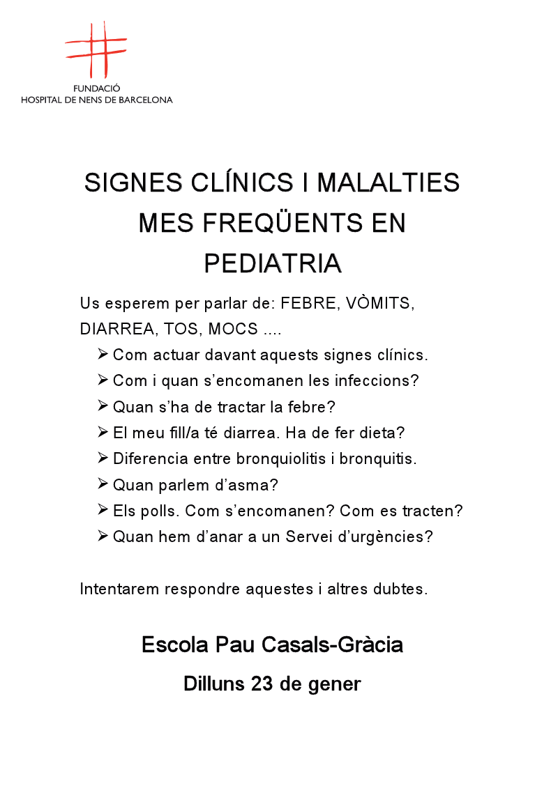 El proper dilluns 23 de gener a les 20.45 hores a l’escola Pau Casals Gràcia es farà la xerrada Malalties freqüents en edat preescolar i escolar, a càrrec de la Fina de l’Escola de Pares de l’Hospital de Nens.