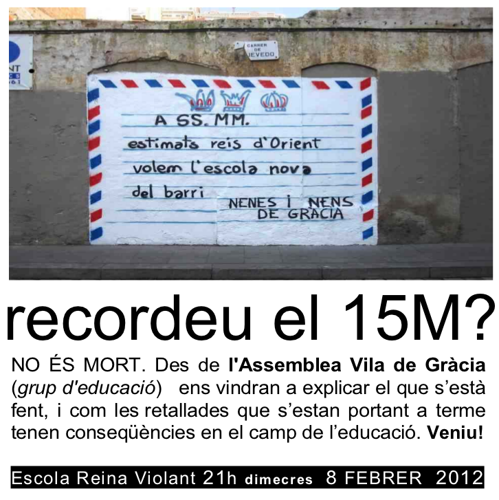 Des de l’Assemblea Vila de Gràcia (grup d’educació) ens volen explicar el que s’està fent, i com les retallades que s’estan portant a terme tenen conseqüències en el camp de l’educació. Veniu!