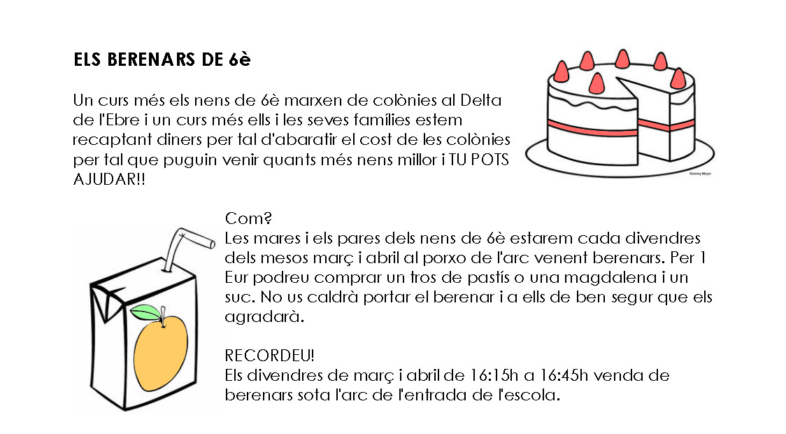 Les mares i els pares dels nens de 6è estarem cada divendres dels mesos març i abril al porxo de l’arc venent berenars. Per 1€ podreu comprar un tros de pastís o una magdalena i un suc. No us caldrà portar el berenar i a ells de ben segur que els agradarà.