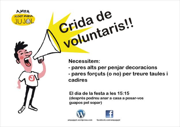 Necessitem voluntaris per decorar el pati el dia de la FESTA Necessitem pares i mares, alts i baixos, forçuts i traçuts pel dia 15 a les 15:15!!! Vinga, com més siguem abans acabarem!!! Comparteix això: Feu clic per enviar un enllaç per correu electrònic a un amic (S'obre en una nova finestra) Correu electrònic Feu clic per compartir al Facebook (S'obre en una nova finestra) Facebook Feu clic per compartir a X (S'obre en una nova finestra) X Feu clic per compartir al WhatsApp (S'obre en una nova finestra) WhatsApp M'agrada S'està carregant... Relacionats