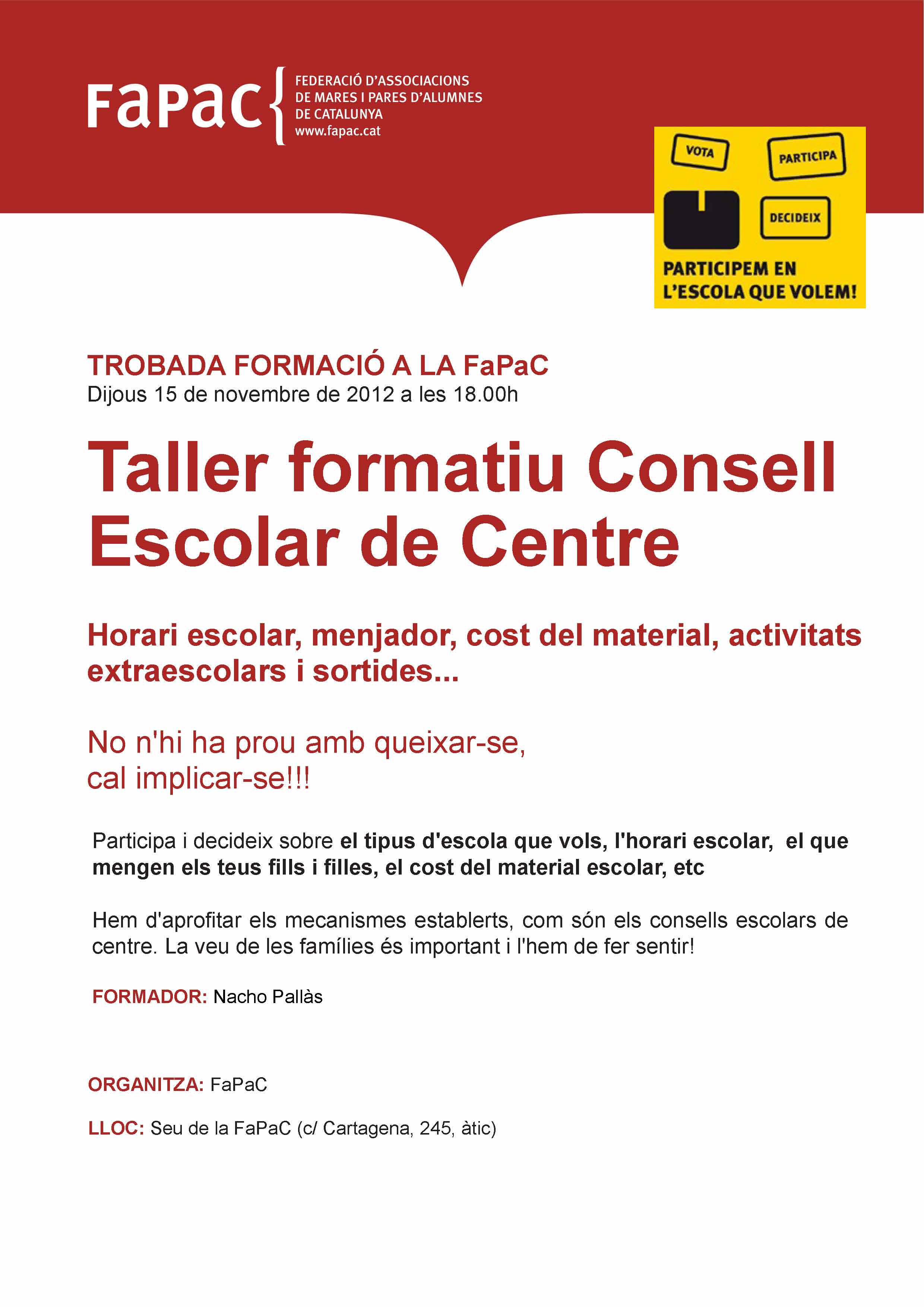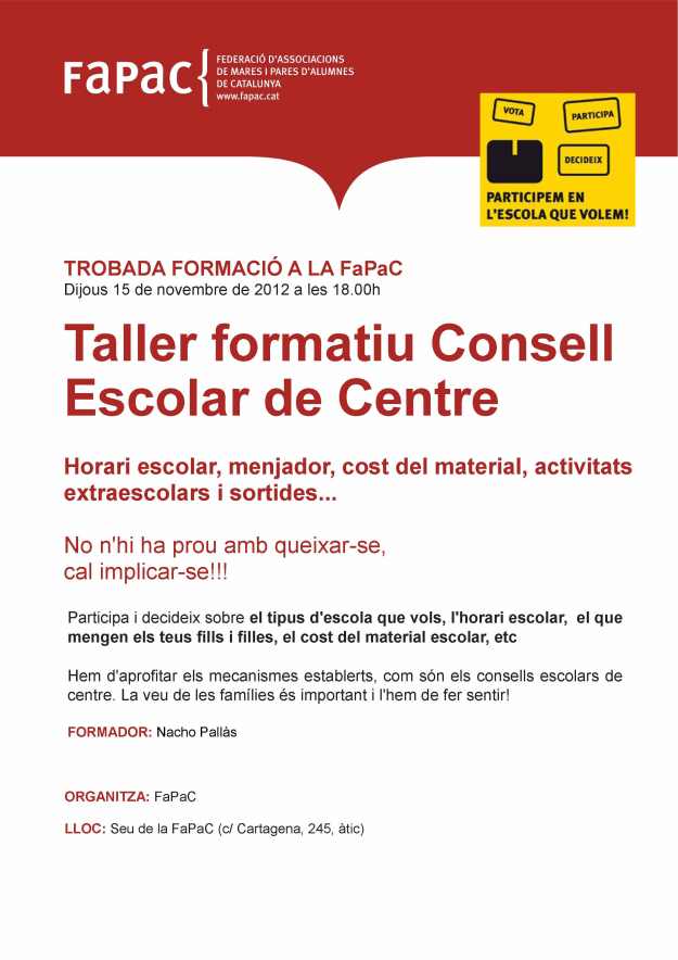 Per a què serveix el Consell Escolar? Perquè cada sector de l’escola estigui representat i pugui manifestar la seva opinió. Perquè l’opinió de cada sector sigui tinguda en compte a l’hora de prendre decisions. Perquè cada sector de l’escola es comprometi en les decisions preses. Amb motiu de la renovació dels consells escolars de centre, el Consell Escolar Municipal de Barcelona ha editat un butlletí i fulls informatius en diferents idiomesper motivar i facilitar la participació. Més informació a la web del Departament d’Educació i a la web de la FaPaC La setmana vinent la FaPaC organitza un Curs gratuït sobre funcionament Consell Escolar de Centre. Dijous 15 de novembre a les 18h a la FaPaC. Si creus que t’interessaria participar-hi envia un mail a presidenciaampajujol@hotmail.com.