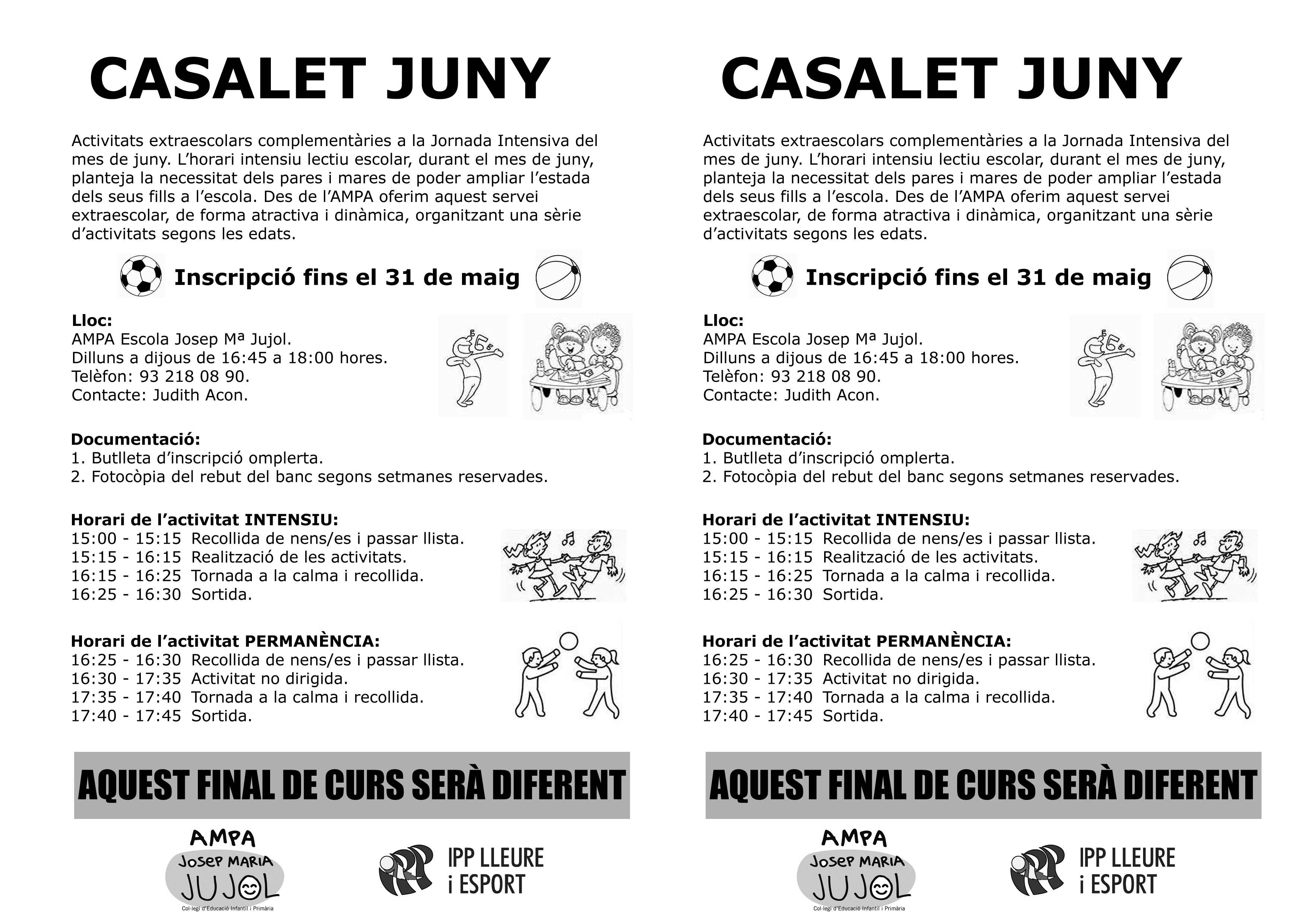 S’acaba el curs i el volem acomiadar com cal. El divendres 14 de juny farem una FESTA de FI DE CURS amb sopar al pati de l’escola. L’AMPA posarà les taules decorades i cadires. Es tracta d’un sopar on cadascú porta lo seu que podrà compartir, si vol, amb els veïns de taula. No oblideu les tovalles, coberts, plats i gots. Veniu ben guapos! Ah, i no oblideu a casa per res del món les ganes de riure i ballar!