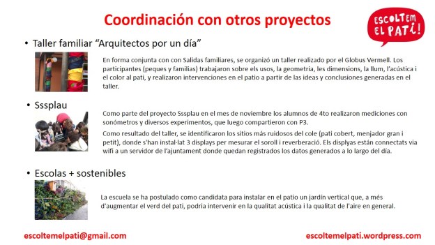 Además del taller familiar “Arquitectos por un día“organizado de manera conjunta con la Comisión de Salidas familiares del AMPA, durante estos meses se han realizado actividades desde el proyecto SSsplau que proporcionaron más elementos para conocer el patio y el sonido.