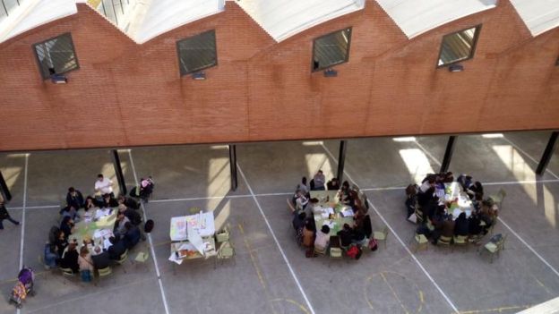 El pasado viernes 17 de abril, nos reunimos en el cole unos 50 padres y madres y unas 10 profesoras para comenzar a concretar las ideas planteadas por el alumnado para el nuevo patio. Comenzamos con una explicación del proyecto (cómo hemos llegado hasta aquí, qué tenemos hasta el momento, cuál es la tarea para el taller, qué queda por hacer), para luego trabajar en tres grupos que se correspondían con los ámbitos de intervención definidos: