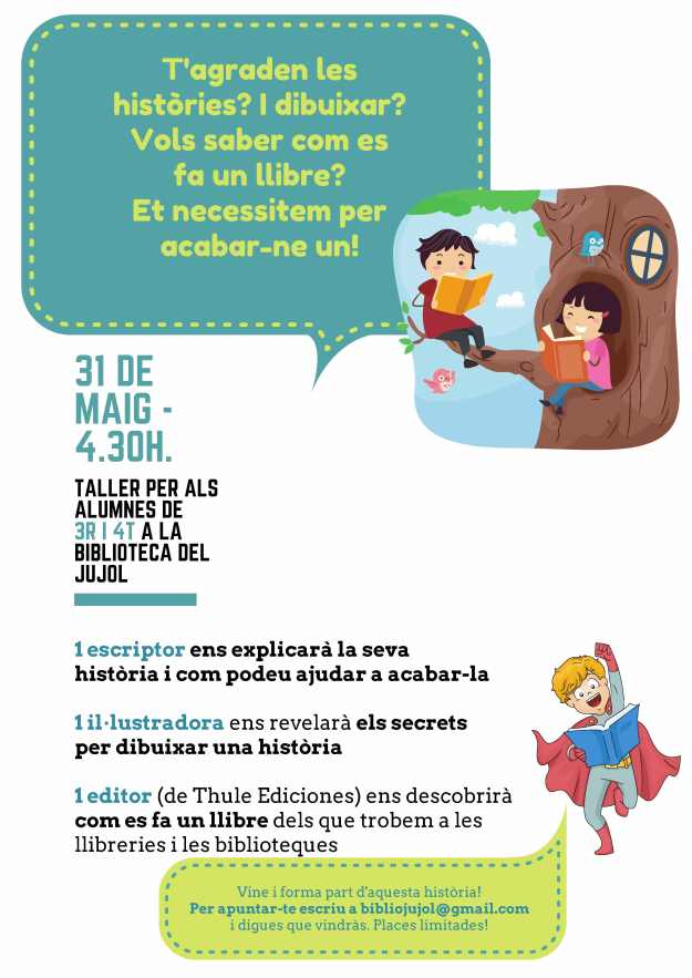 Volem explicar als nens de 3er i 4rt com es fa un llibre. Per fer-ho més pràctic, l’autor, el Ramón (que és pare de l’escola), portarà una història, no publicada encara, dirigida a nens d’aquesta edat i que té algunes il·lustracions fetes, però moltes altres per acabar. Es tracta que ells puguin fer les seves il·lustracions i contribuir a tancar el llibre. Per a això, hem demanat a una il·lustradora, la Kasya (també mare del Jujol), que els expliqui què hem de tenir en compte quan dibuixem per il·lustrar una història, a part de la seva experiència. I, per tancar el cercle, des de Thule ediciones ens explicaran com es fa realitat un llibre, quin procés se segueix, com trien les històries, els materials, la impremta, la distribució, etc. Donat el tipus de públic, no es tracta tant d’entrar en els detalls com que es facin una idea general de com funciona i que els alumnes puguin fer preguntes sobre allò que pugui intrigar-los més.