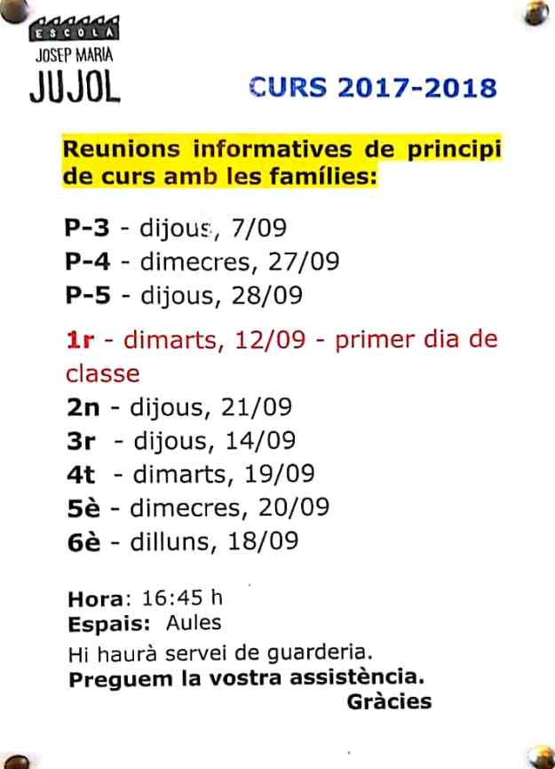 Per tant, els que necessiten canviar de dia o vulguin apuntar els nens amb aquesta nova opció hauran de venir dijous 28 de setembre a una reunió especial de Bàsquet a les 16:45 a la Jujol. Els pares dels nens que ja estan apuntats i no volen canviar de dia no cal que vinguin.