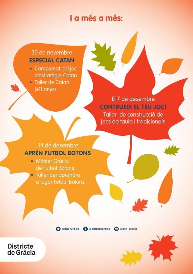 A partir d’aquest divendres 16 de novembre i fins divendres 14 de desembre a la Plaça del Sol s’organitzaran jocs de taula i jocs tradicionals per a infants, famílies i persones de totes les edats. Com a activitats extraordinàries es farà un campionat del joc d’estratègia CATAN (30 de novembre), Futbol de Botons (14 desembre) i un taller per a construir un joc de taula (7 desembre).