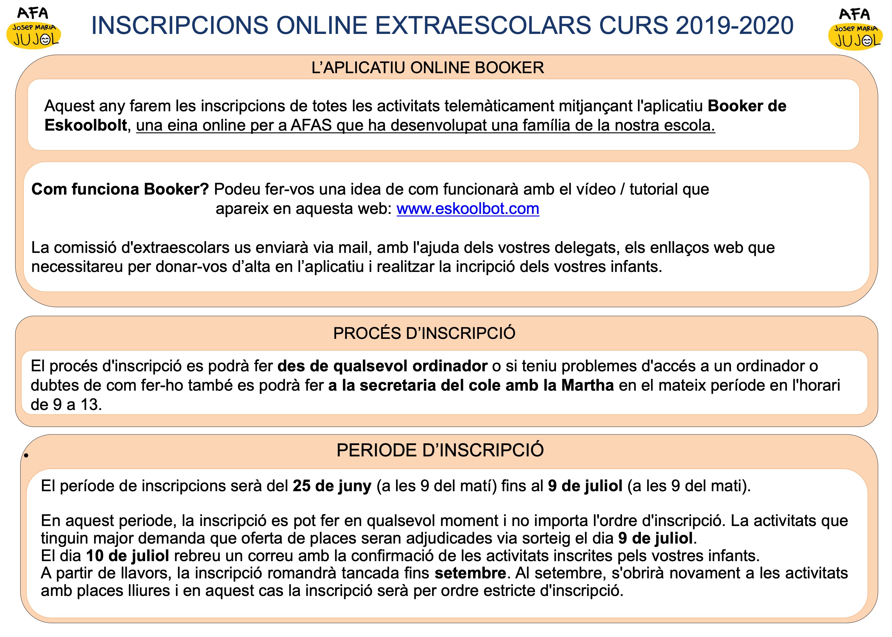 Com ja us vam avançar a una entrada del blog anterior, aquest curs estrenem el procés d’inscripció totalment online fent servir l’aplicatiu Booker de Eskoolbolt, una eina online per AFAS desenvolupada per una família de la nostra escola que ens permetrà gestionar el procés d’inscripció de manera telemàtica.