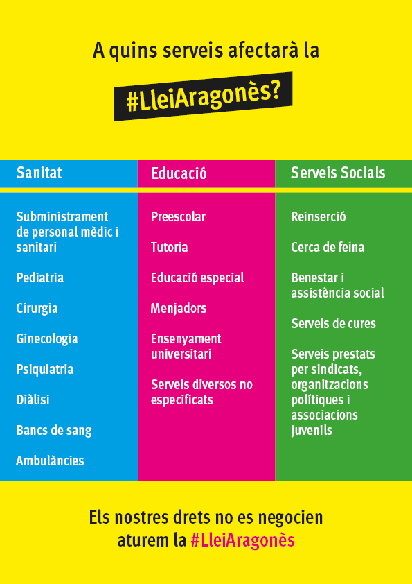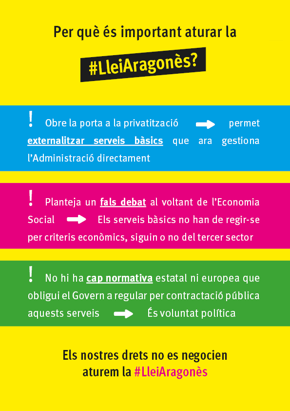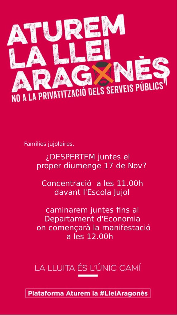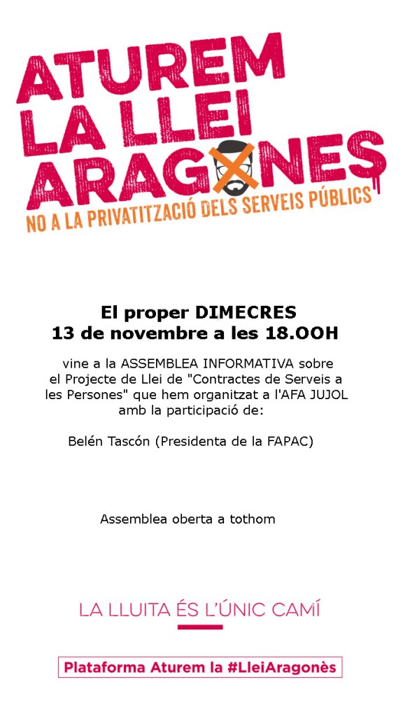 Ja fa temps que sentim a parlar de que cal aturar la llei Aragonès, ja que dóna peu a la privatització de molts serveis públics. AFA Jujol es suma a aquesta reivindicació i ha organitzat una assemblea informativa el dia 13 de novembre a les 18:00h on participarà la Belén Tascón, presidenta de la FAPAC (hi haurà servei d’acollida).