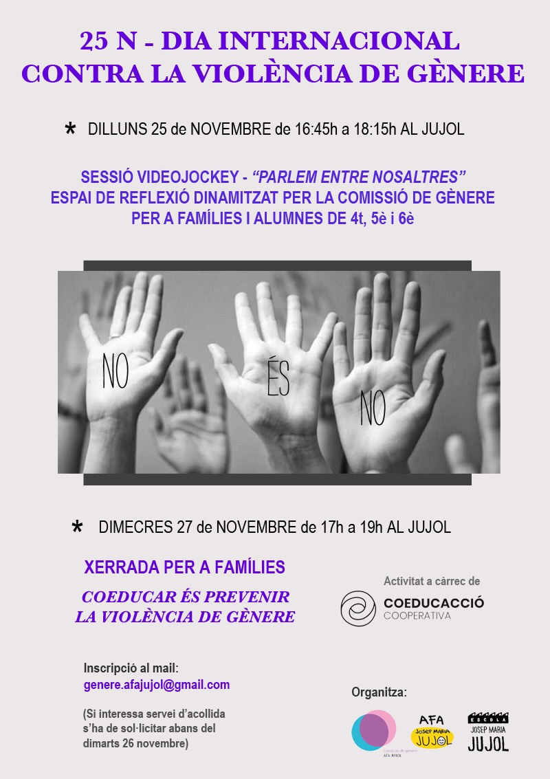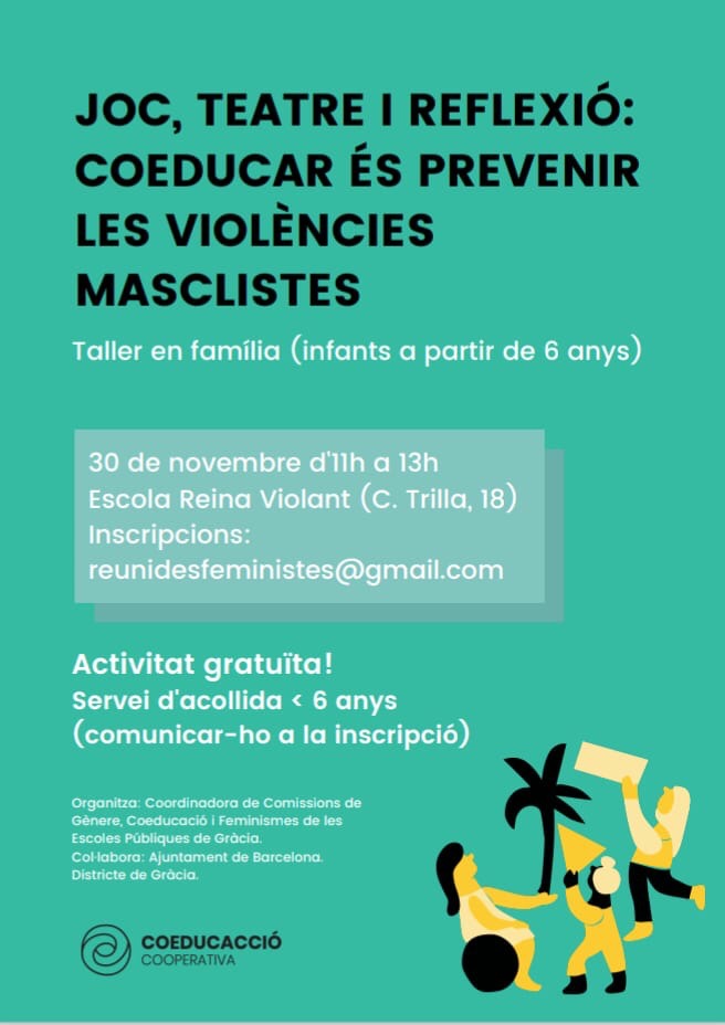 Entorn del 25N, la comissió de gènere us proposa de participar a una activitat gratuïta de joc, teatre i reflexió per a infants a partir de 6 anys.L’activitat està organitzada per la Coordinadora de comissions de Gènere, Feminismes i Coeducacció de les escoles públiques de Gràcia i dinamitzada per l’entitat Coeducacció. Tindrà lloc aquest dissabte 30/11 de 11h a 13h a l’escola Reina Violant (C. Trilla 18) Només us heu d’inscriure a: reunidesfeministes@gmail.com