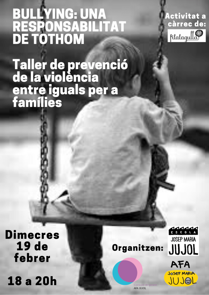 El dimecres 19 de febrer de 18 a 20h proposem un taller impartit per una sòcia de la cooperativa Fil a l’Agulla i adreçat a les famílies de l’escola i del barri i obert al professorat. Es tracta d’un taller de sensibilització sobre les dinàmiques de discriminació entre iguals, i una de les seves formes més extremes, el bullying. Abordarem el tema des d’un enfocament sistèmic, i reflexionarem sobre què afavoreix el bullying: factors familiars, creences al voltant de la diversitat, i característiques de l’entorn escolar. També analitzarem els diferents rols dins d’una relació abusiva discriminatòria. Per acabar donarem algunes claus sobre com les famílies podem actuar en relació als nostres fills en els diferents rols: víctima, agressor o testimoni, i com a membres de la comunitat escolar.