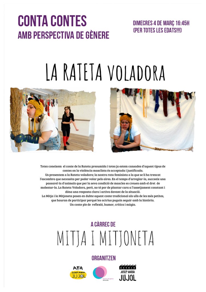 Ja tenim aquí la setmana del 8 de març i la comissió de gènere vol oferir un conte per totes les edats amb perspectiva de gènere on sortim dels rols clàssics! La companyia de Mitja i Mitjoneta fa una versió feminista de ‘La rateta presumida‘ amb ‘La rateta voladora‘, un conte ple de reflexió, humor i màgia 😉