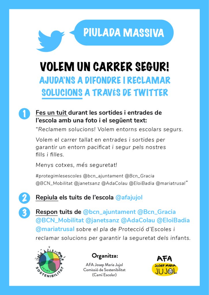 Reclamem solucions! Volem entorns escolars segurs. – Volem el carrer tallat en entrades i sortides per garantir un entorn pacificat i segur pels nostres fills i filles. – #protegimlesescoles @bcn_ajuntament @Bcn_Gracia @BCN_Mobilitat @janetsanz @AdaColau @EloiBadia @mariatrusal