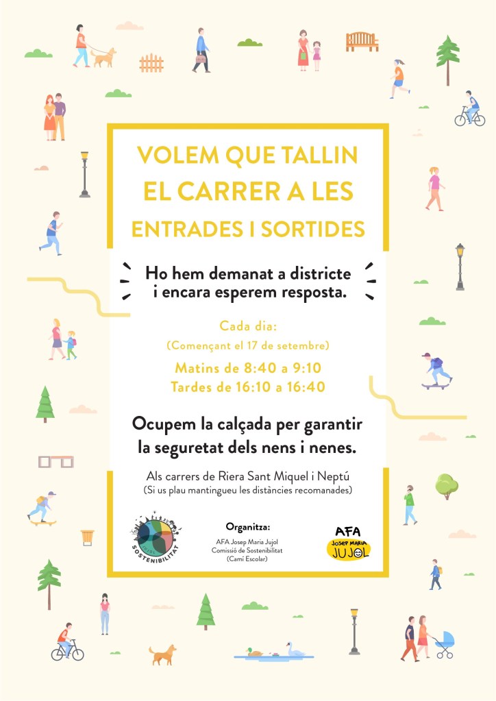 Per tal de garantir la seguretat dels nostres infants durant les entrades i sortides a l’escola en les condicions excepcionals que ens trobem, i tenint en compte que hem observat un volum important de trànsit durant els primers dies d’escola, hem demanat al districte que talli el carrer durant les entrades i sortides per garantir que aquestes es puguin fer sense aglomeracions. Paral·lelament hem de continuar reivindicant la necessitat que circulin menys cotxes i a menys velocitat, i convertir el carrer de l’escola en una via segura pels nostres fills i filles.