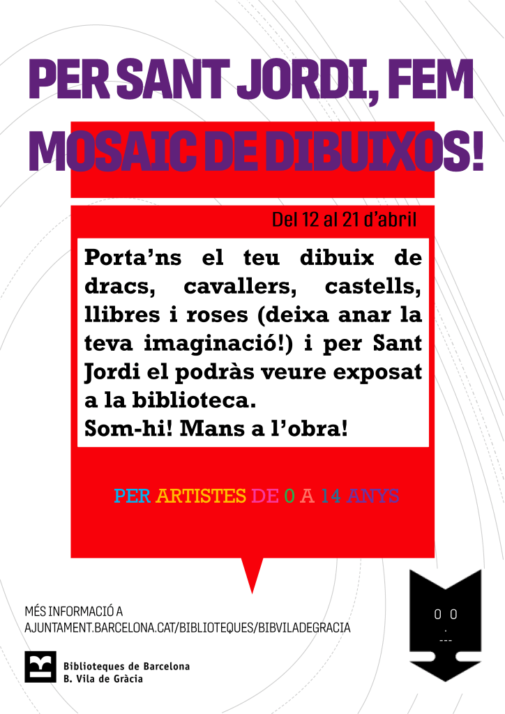 Del 12 al 21 d’abril: Porta’ns el teu dibuix de Sant Jordi (dracs, castells, cavallers, llibres, roses…) a la biblioteca Vila de Gràcia (àrea infantil, planta 1). Poden ser dibuixos en paper fins a DIN A4. Collages, aquarel·la, pintures, còmics, deixa anar la teva imaginació!