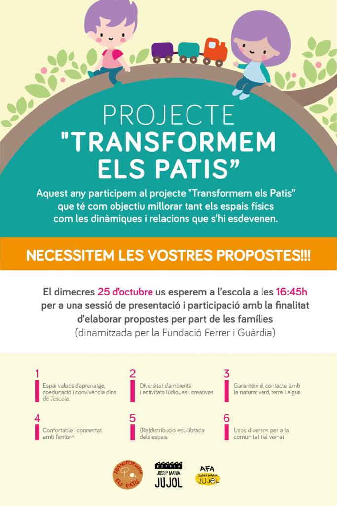Sessió de presentació i participació del projecte Transformem els Patis Jujolaires, aquest curs transformem el pati de l’escola! Veniu a conèixer el projecte el proper dimecres 25 d’octubre a les 16.45h a l’escola. Ara és el moment de fer les propostes! Actualització: hi haurà servei d’acollida. Comparteix això: Feu clic per enviar un enllaç per correu electrònic a un amic (S'obre en una nova finestra) Correu electrònic Feu clic per compartir al Facebook (S'obre en una nova finestra) Facebook Feu clic per compartir a X (S'obre en una nova finestra) X Feu clic per compartir al WhatsApp (S'obre en una nova finestra) WhatsApp M'agrada S'està carregant...
