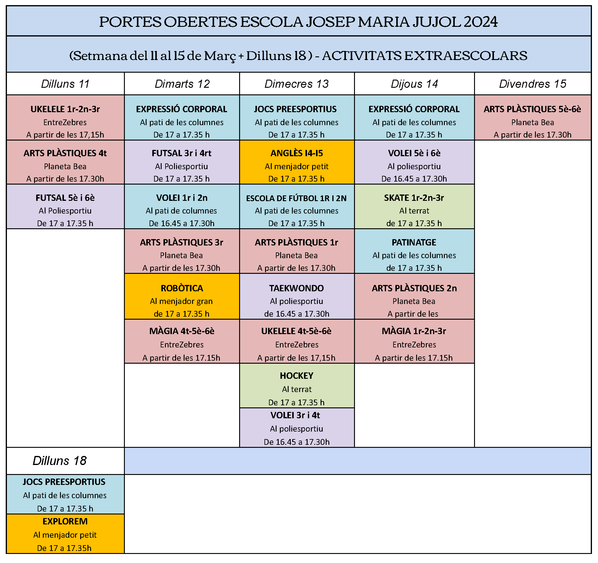 Us convidem a la jornada de portes obertes de les activitats extraescolars. Aquesta jornada es realitzarà la setmana del 11 al 15 de març i el dilluns 18 de març. En la següent imatge trobareu el dia i hora per cadascuna de les activitats. Veureu que cadascuna de les activitats té programat un dia concret i un horari determinat segons el que es realitzi a l’activitat.