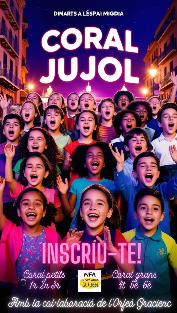 Cantar ens fa més lliures! Apunta’t a la coral infantil de l’escola Josep Maria Jujol, la nova extraescolar d’1 hora els dimarts a l’espai migdia. Coral de petits per a 1r, 2n, 3r i de grans per a 4t, 5è i 6è.