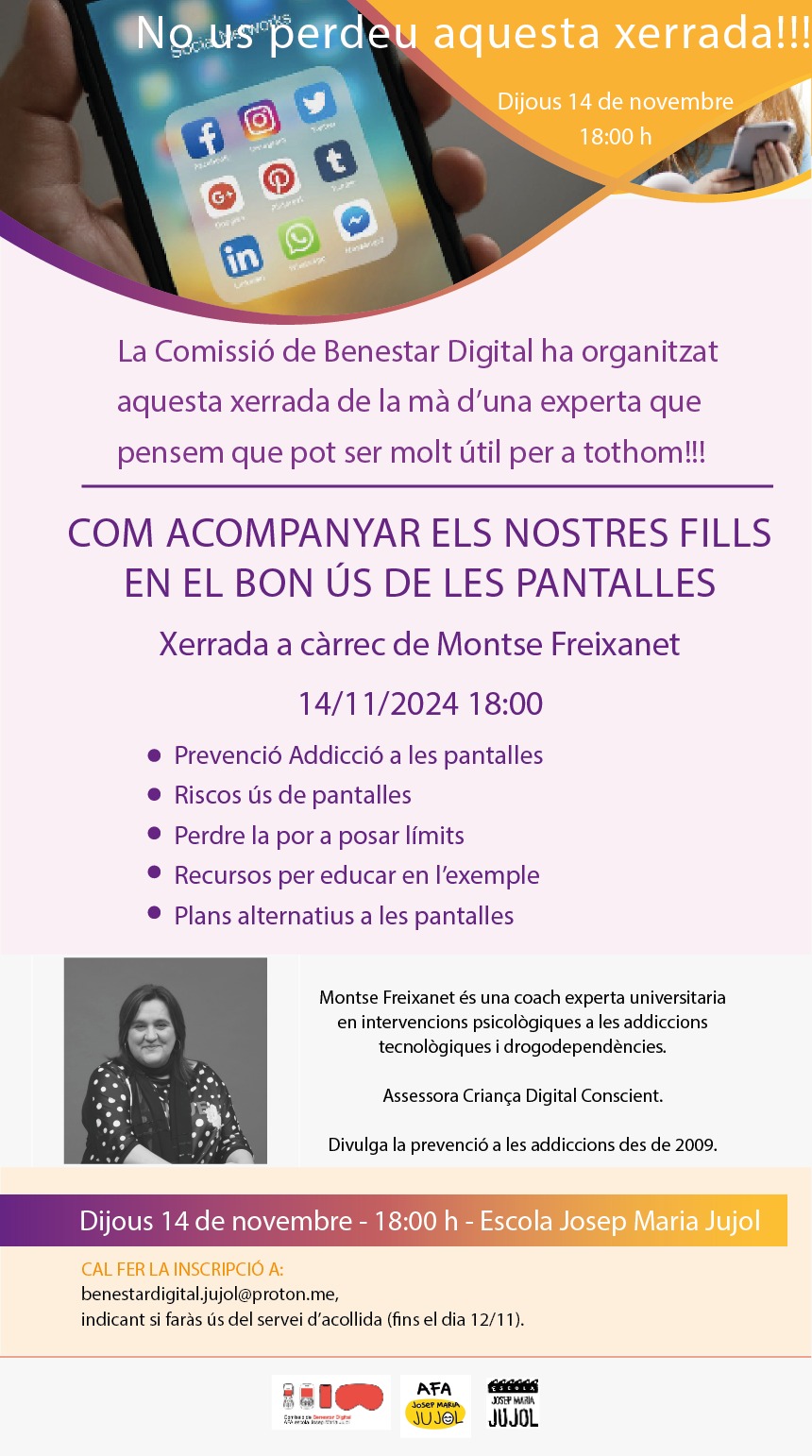 La Comissió de Benestar Digital us convida a una xerrada de la mà de la Montse Freixanet, experta en temes d’ús (i abús) de pantalles en infants i adolescents. 💻📱