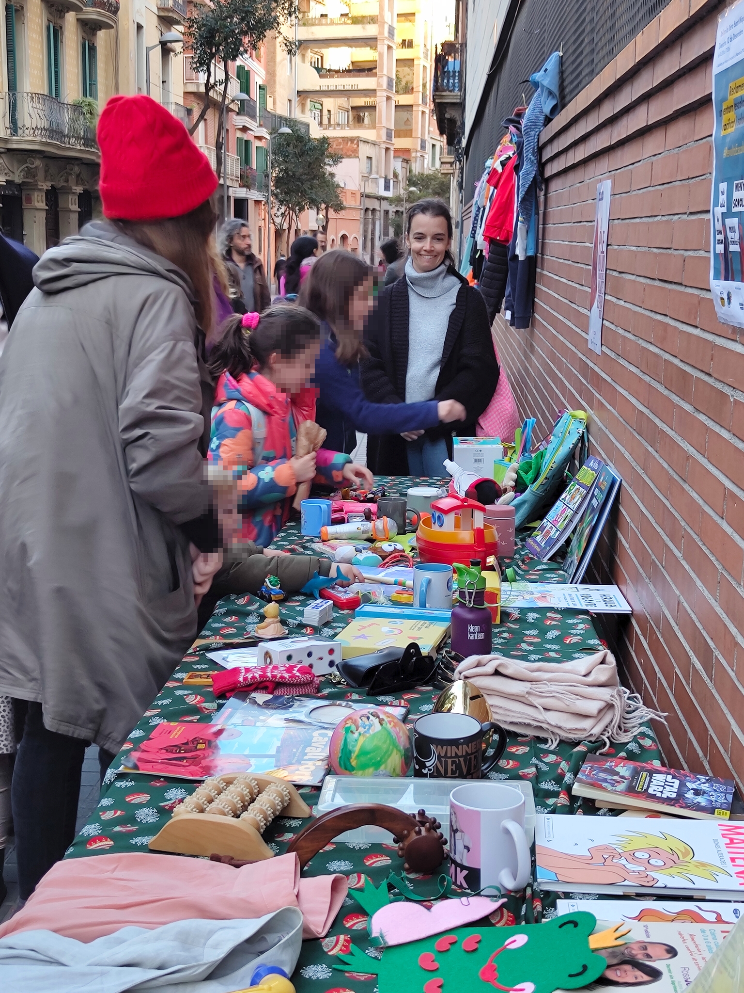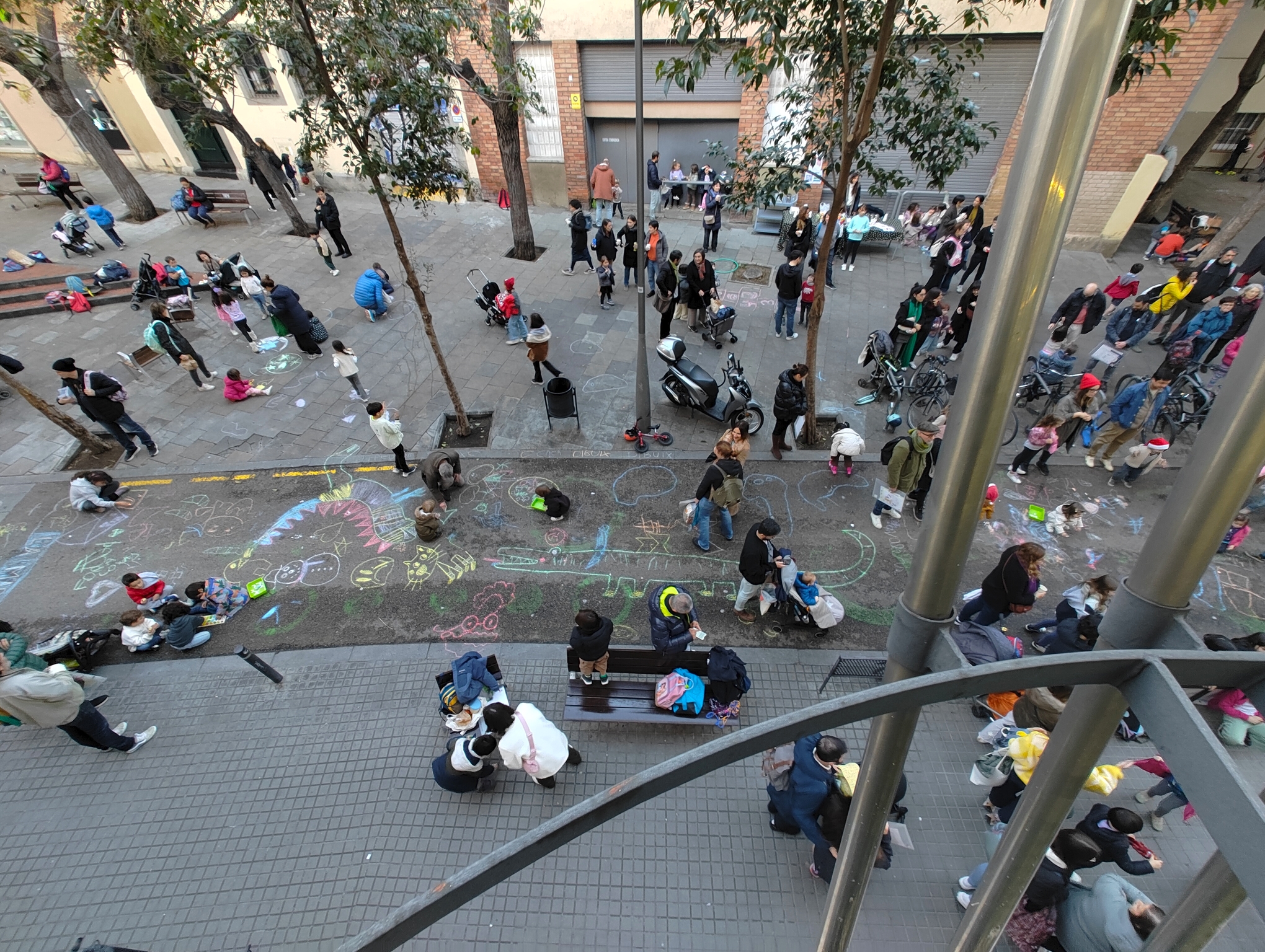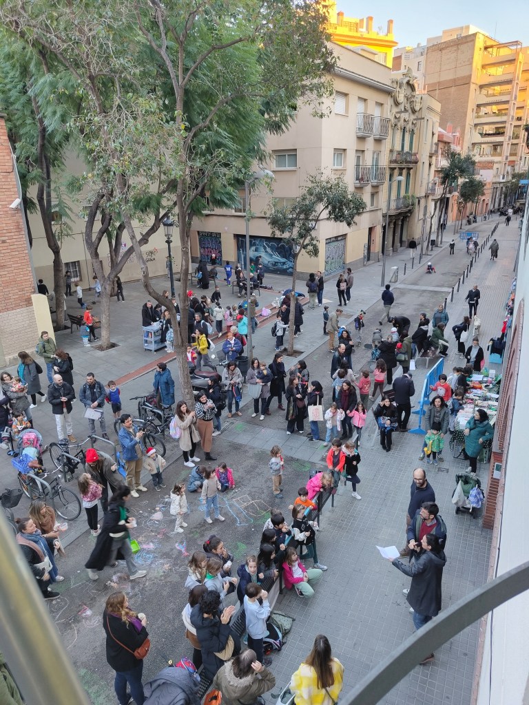 Durant el tall de trànsit, vam gaudir d’un carrer lliure de cotxes on els infants van poder jugar i moure’s amb llibertat mentre es duien a terme activitats lúdiques i creatives; biblioteca al carrer, carreres de sacs, xarranca, pintura amb guixos, paradeta de tès i Mercadillo de pongos. Va ser una demostració palpable del potencial que té pacificar els carrers del nostre barri: un espai per a tothom, més segur i saludable.