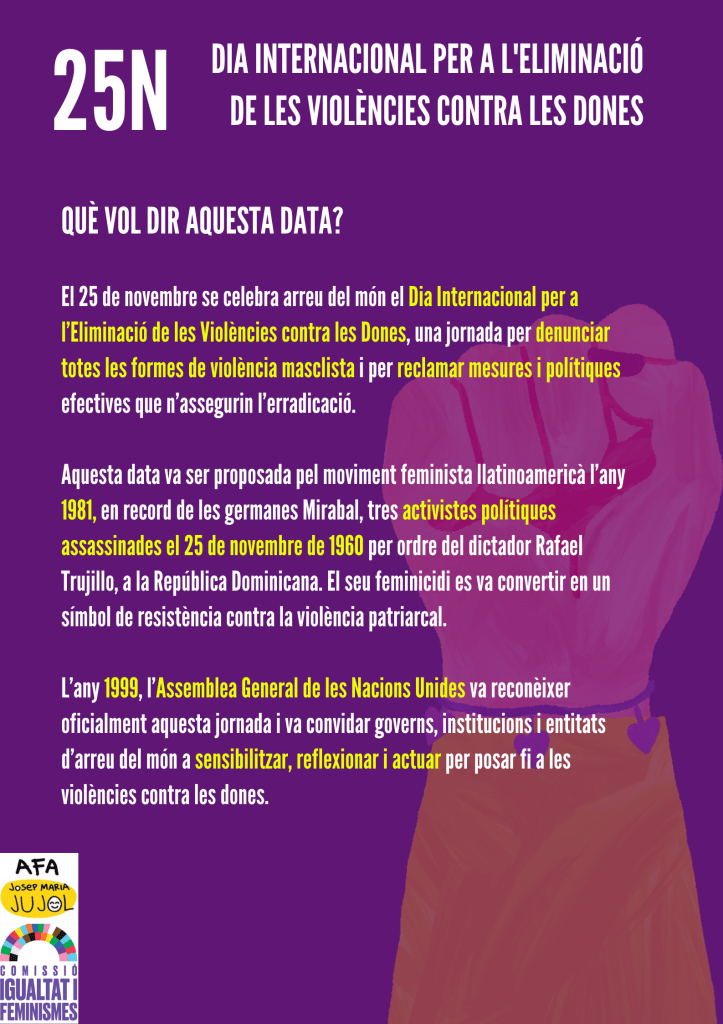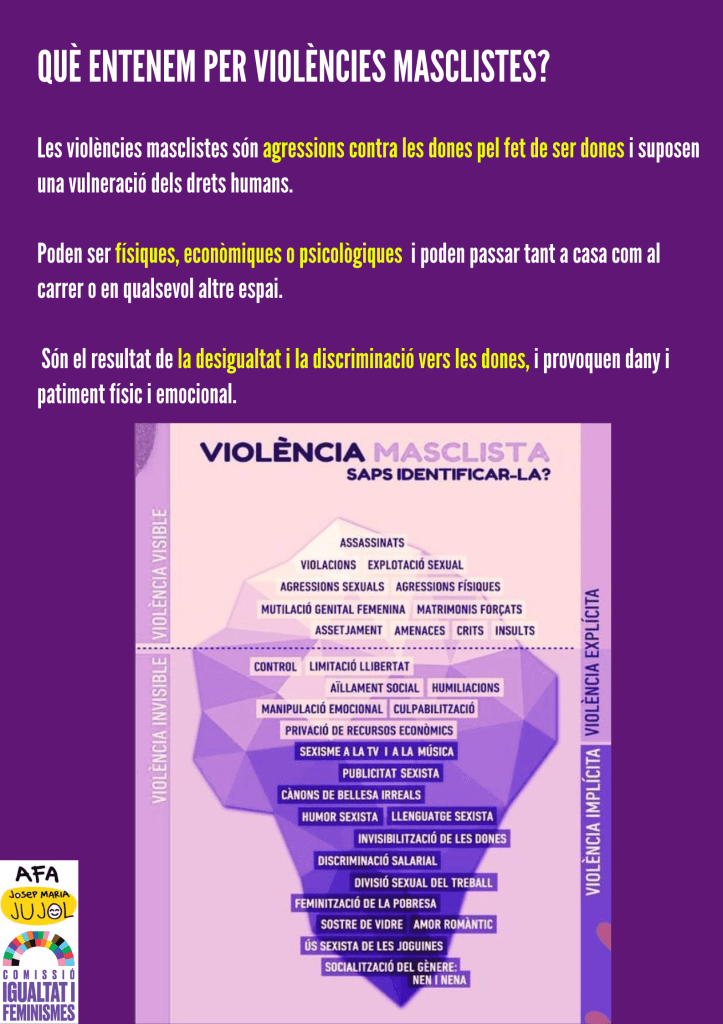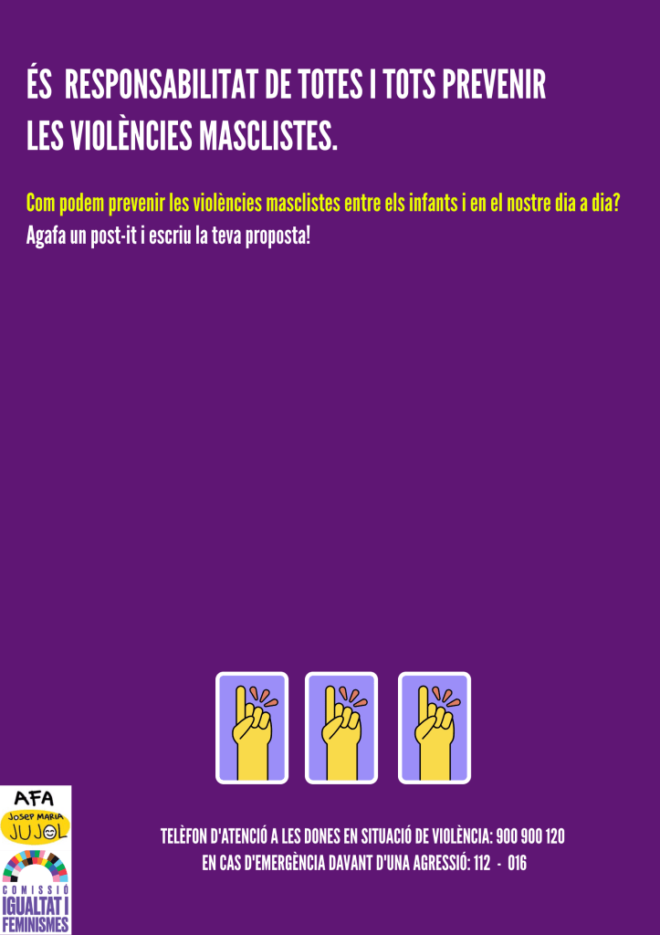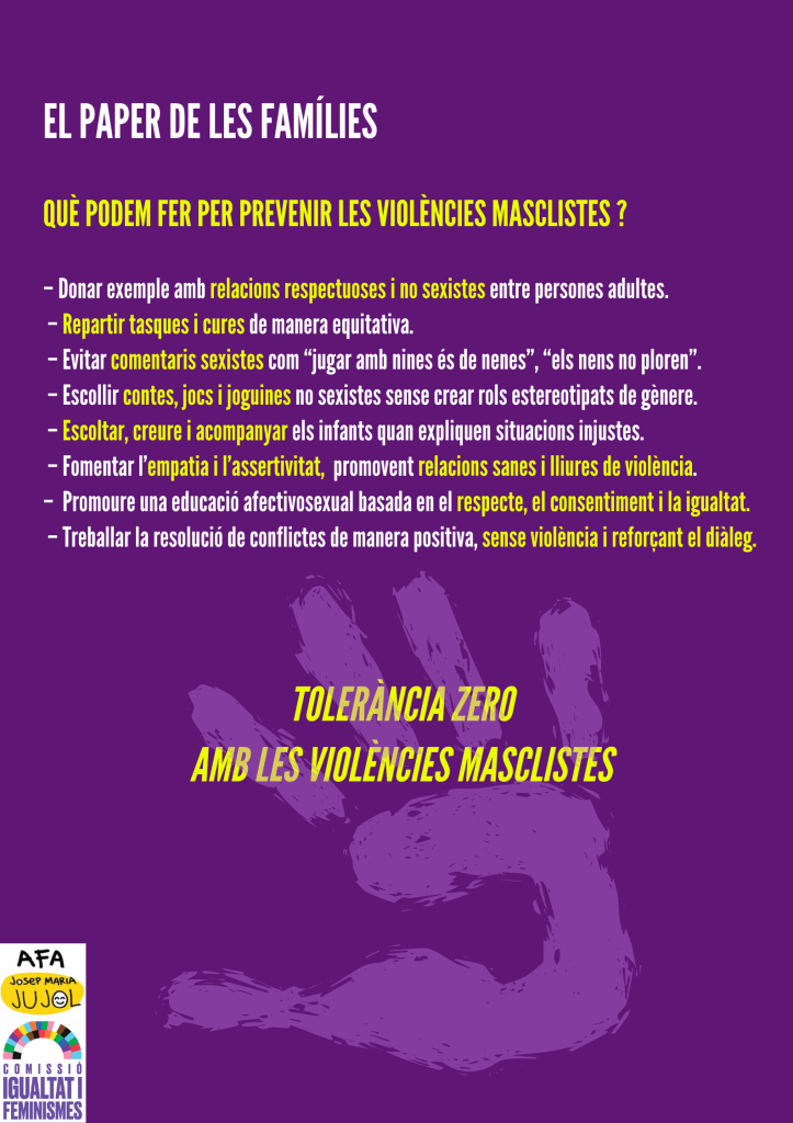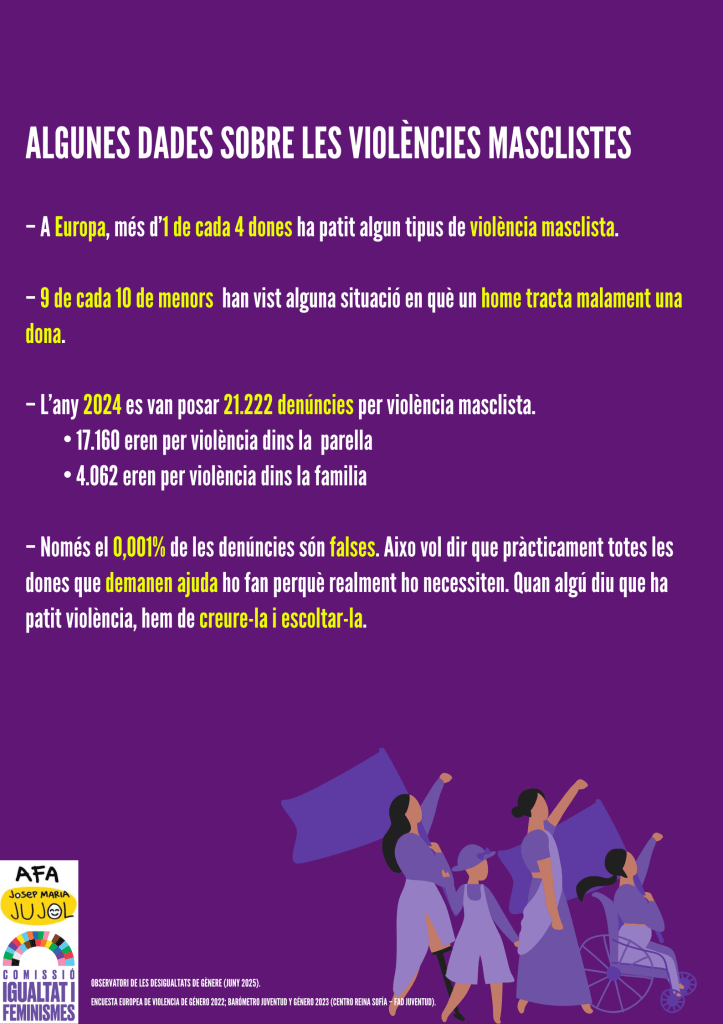 Des de la Comissió d’Igualtat i Feminismes de l’AFA de la nostra escola, volem posar en valor aquesta jornada i convidar tota la comunitat educativa a implicar-se activament en la prevenció, la sensibilització i el rebuig de qualsevol forma de violència masclista.