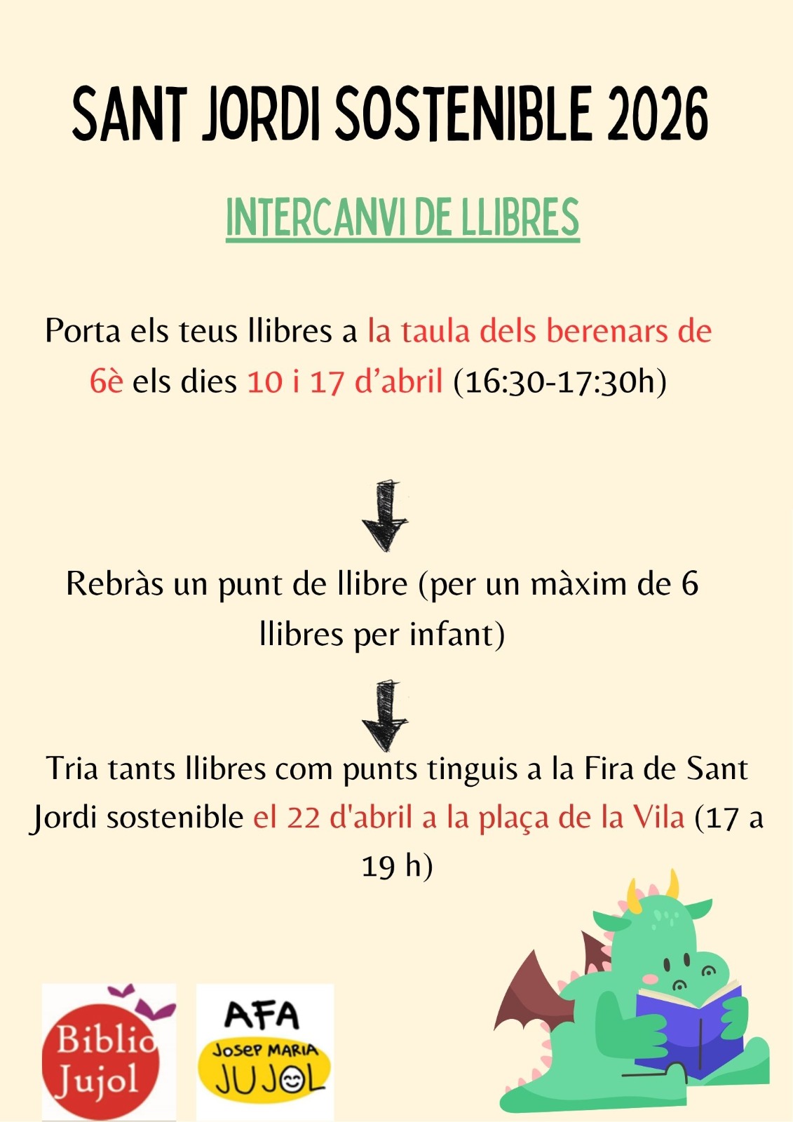 - Porta els teus llibres a la taula de berenars de 6è els dies 10 i 17 d’abril (16:30–17:30h).