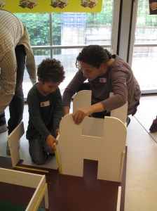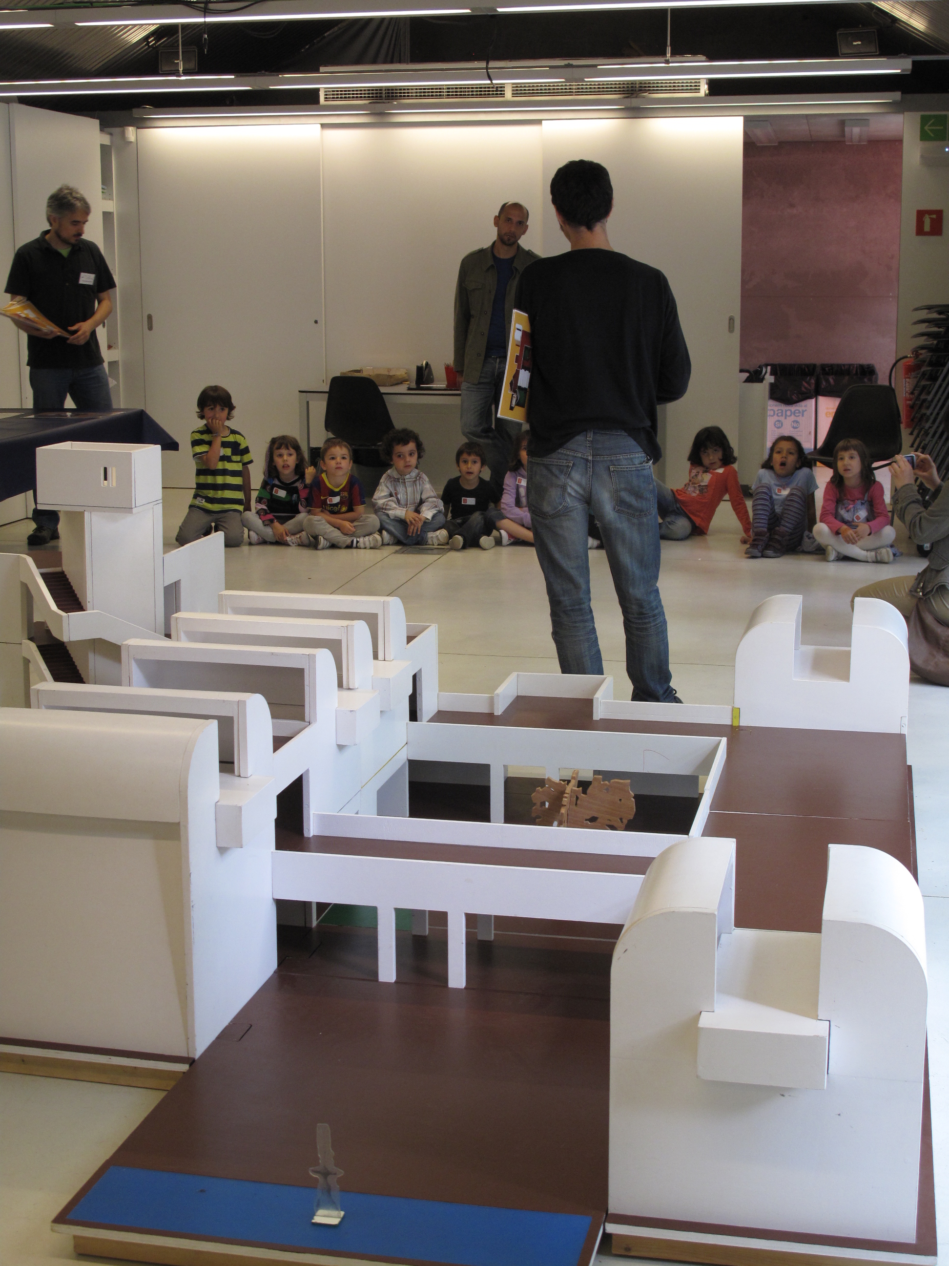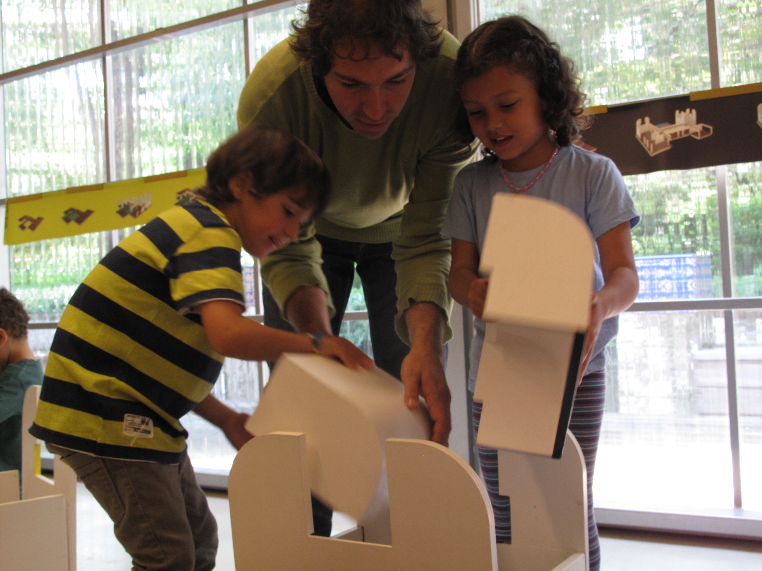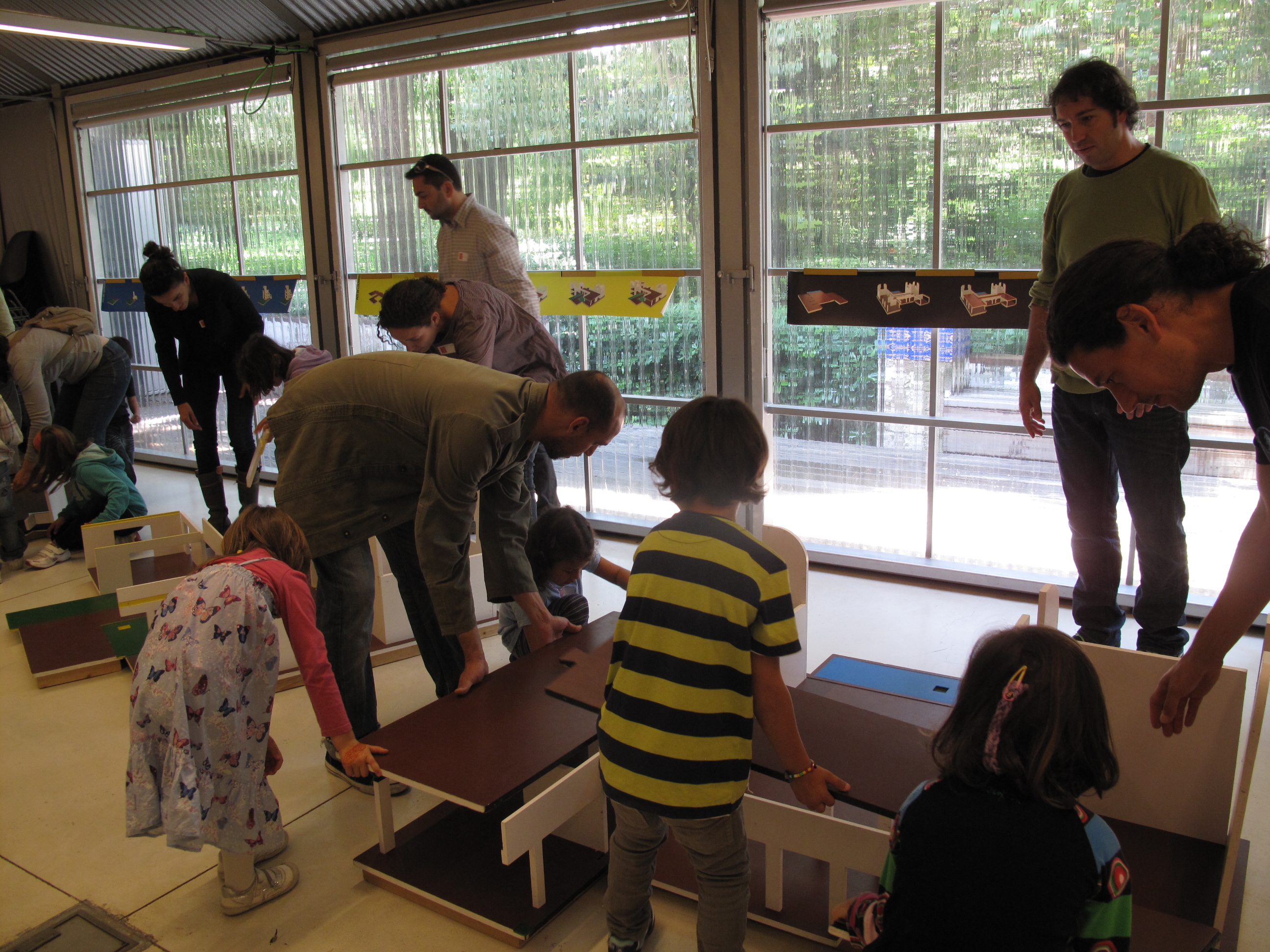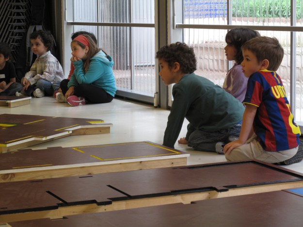 I un cop ja coneixien bé l’edifici, es van dirigir cap al pavelló a construir una maqueta gegant. Però com l’edifici és molt gran, s’havien de fer grups, un per cada pati: ho recordeu? El pati de l’olivera, el pati de l’aigua i el pati del garrofer!