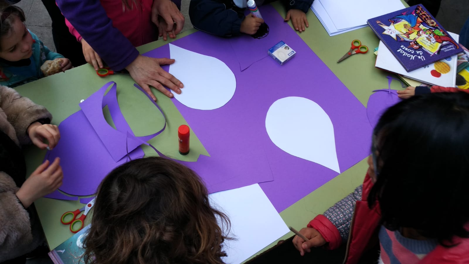Per preparar la vaga feminista del 8 de març, la comissió de gènere proposa una activitat per estampar davantals amb pintura de mans lila, que després penjarem a la façana de l’escola.