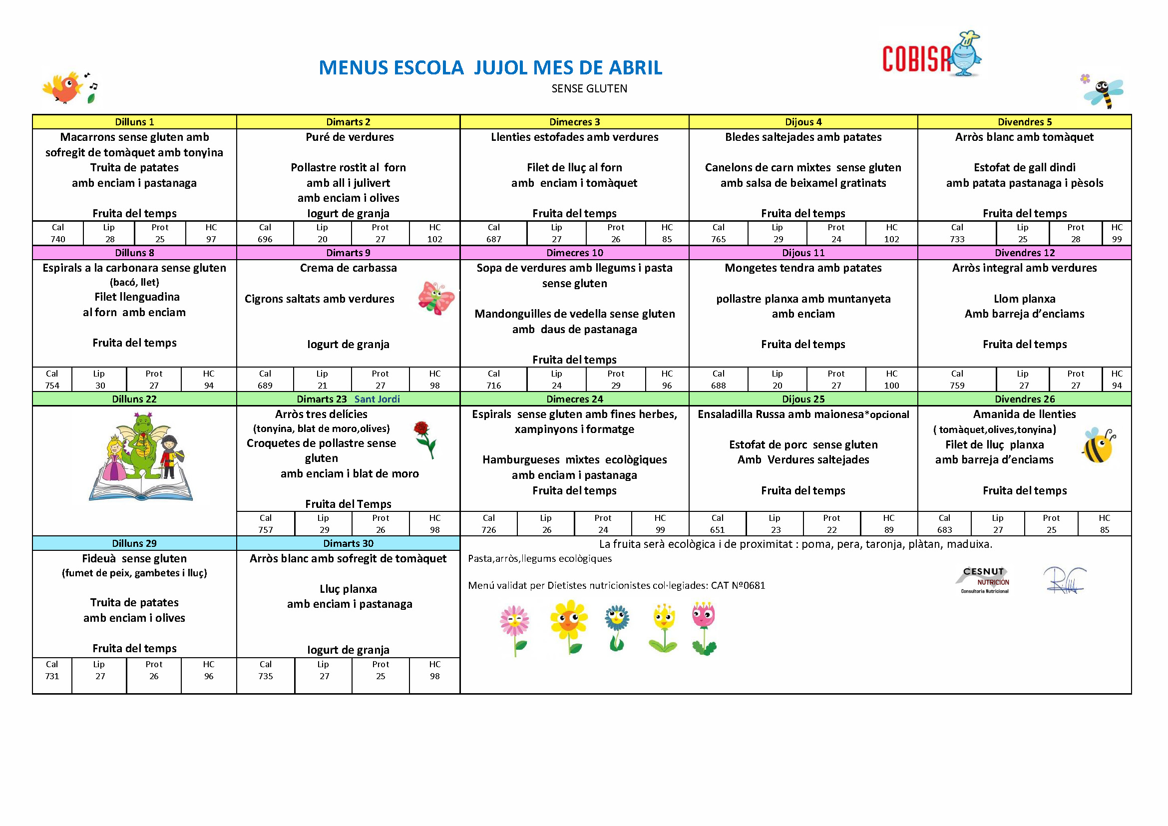 MENU ABRIL 2019 JUJOL SENSE GLUTEN