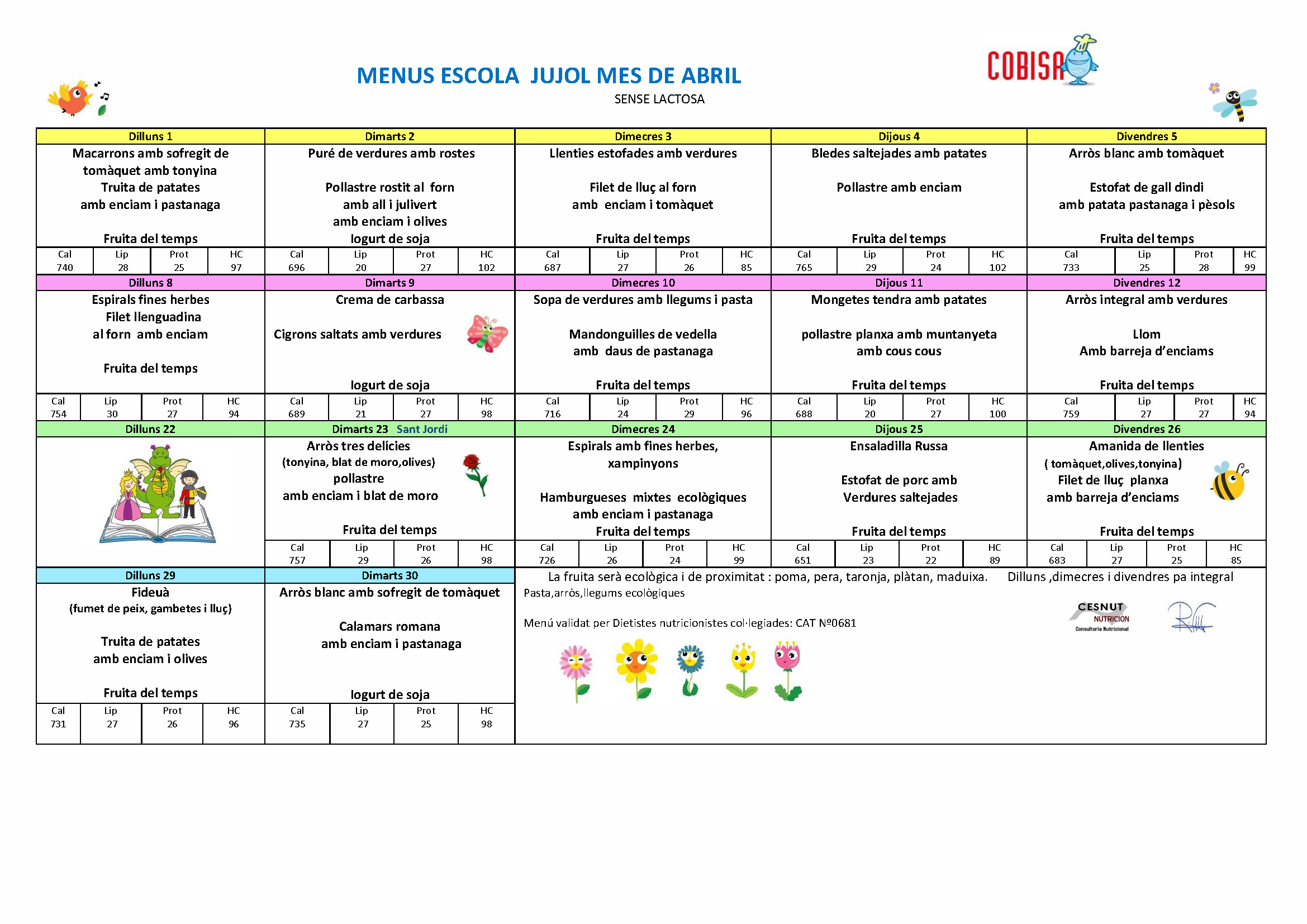 MENU ABRIL 2019 JUJOL SENSE LACTOSA