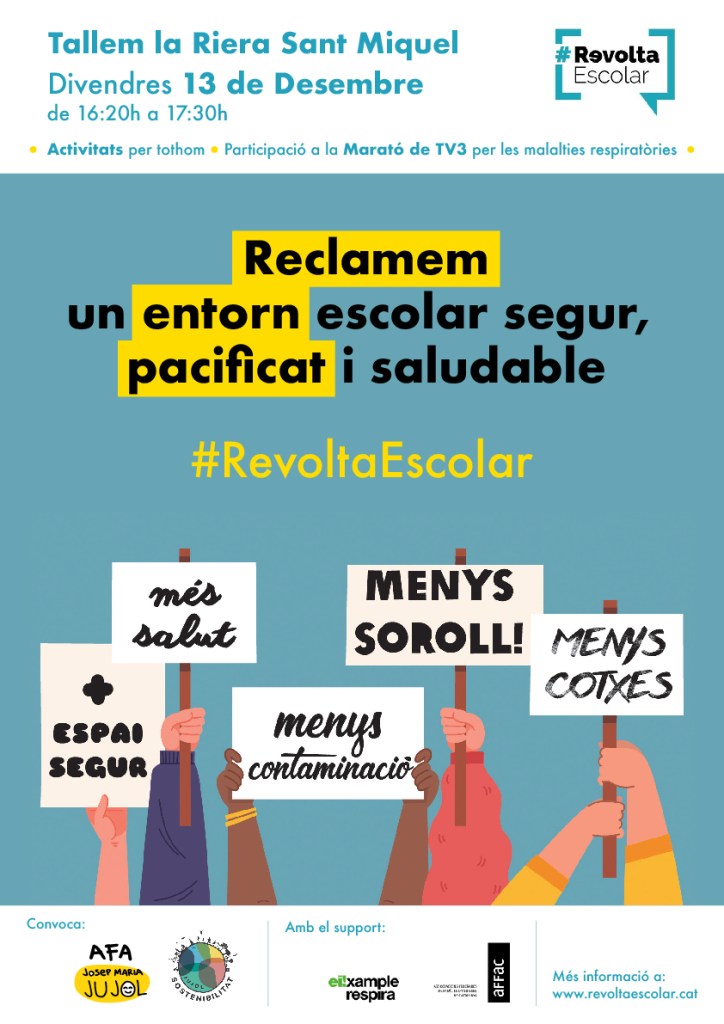 I també, dins del marc de la Revolta Escolar, us convidem a participar en el tall de trànsit que farem el proper divendres 13 de desembrede 16:20h a 17:30h davant de l’escola. Enguany, l’acció se suma a la La Marató de TV3 que aquest any és sobre Malalties Respiratòries. Des de la Comissió farem activitats per recaptar fons per a la recerca d’aquest tipus de malalties.